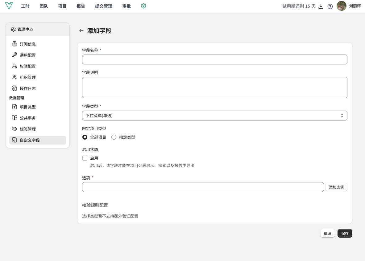 - 维拉工时管理员在设置中,可以创建适用于不同项目的自定义字段