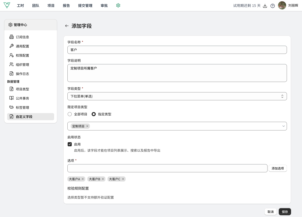 - 启用状态:勾选后,自定义字段会根据设置生效,可以在项目列表、项目详情和报告中查看该字段;未勾选则无法查看