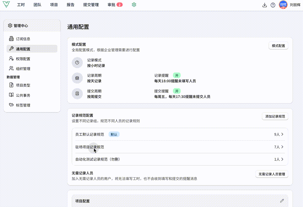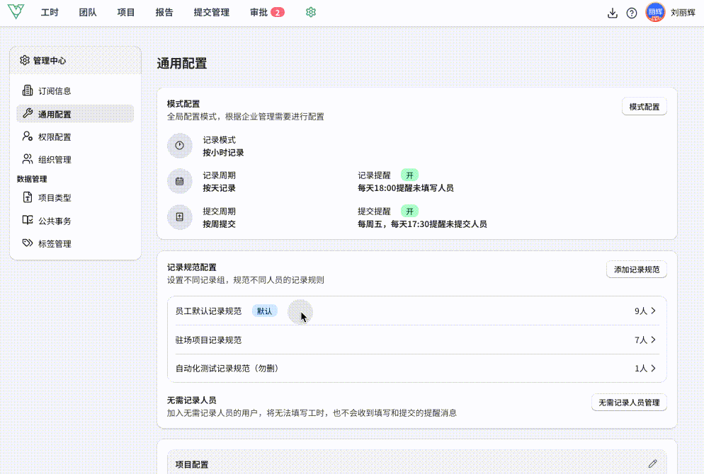 企业可以调整默认规范名称、标准工时时长、休息日配置和管理校验规则。