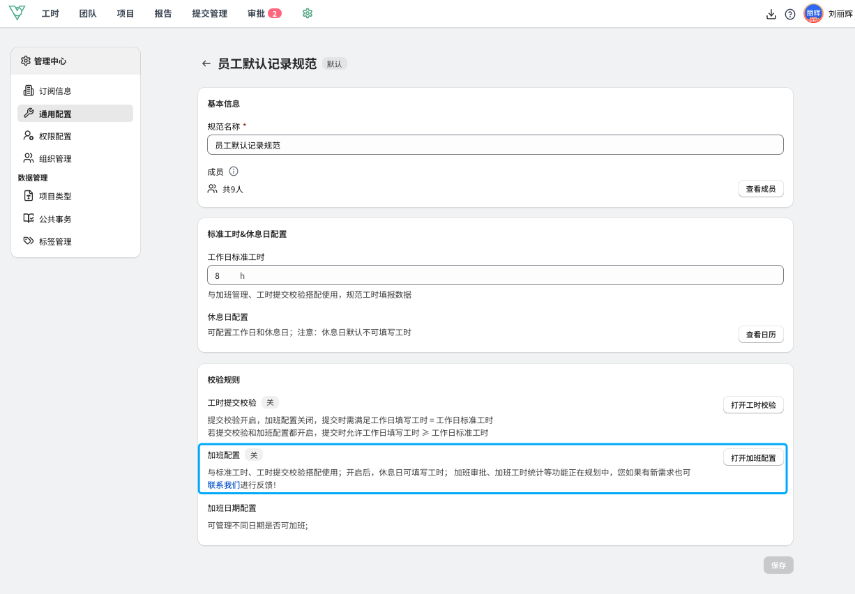 成员可以记录超出标准工时,并会进行区分展示。维拉工时管理员可以在设置/通用配置/记录规范 管理中管理企业是否需要开启加班。
