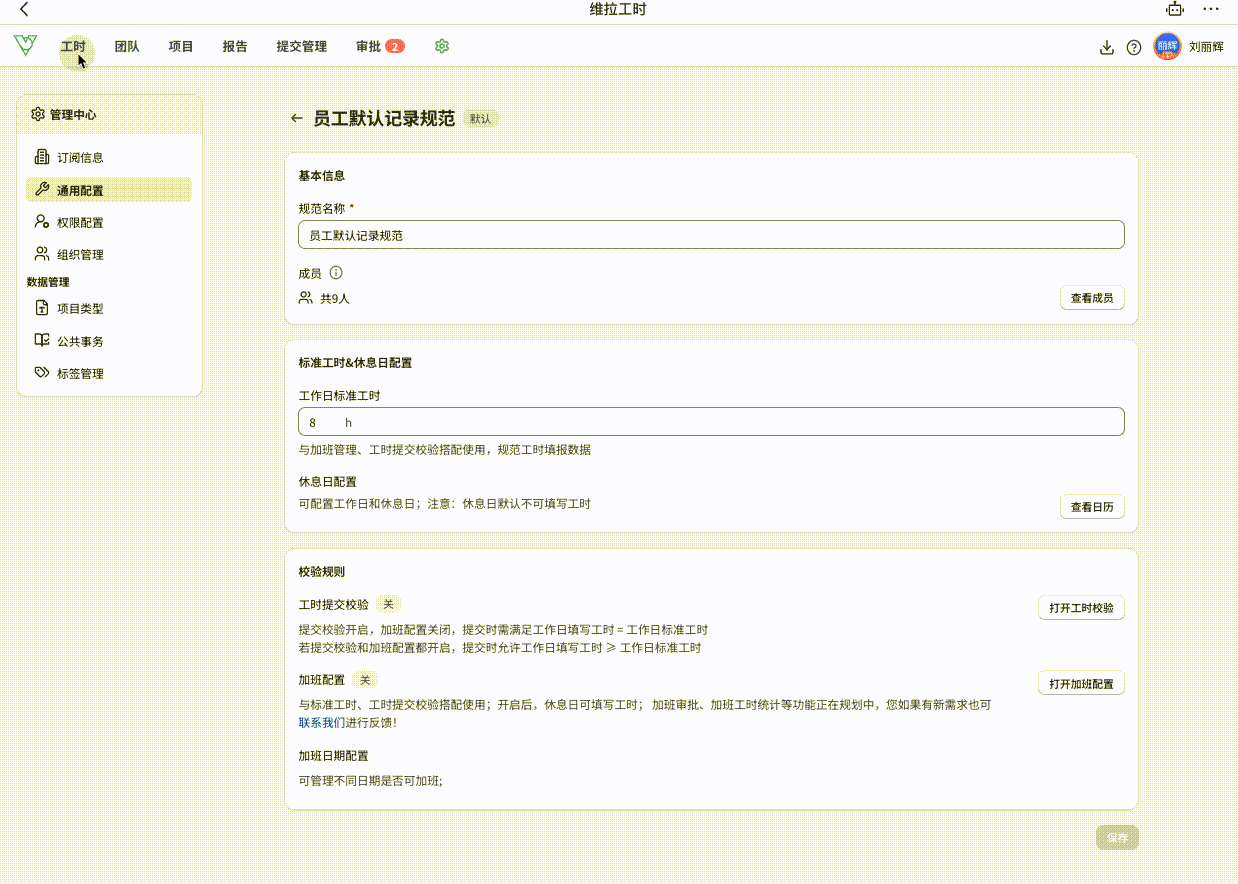 - 设置所有工时日的标准时长。标准工时的数值会影响记录工时的颜色展示、提交管理中应记录工时的总数