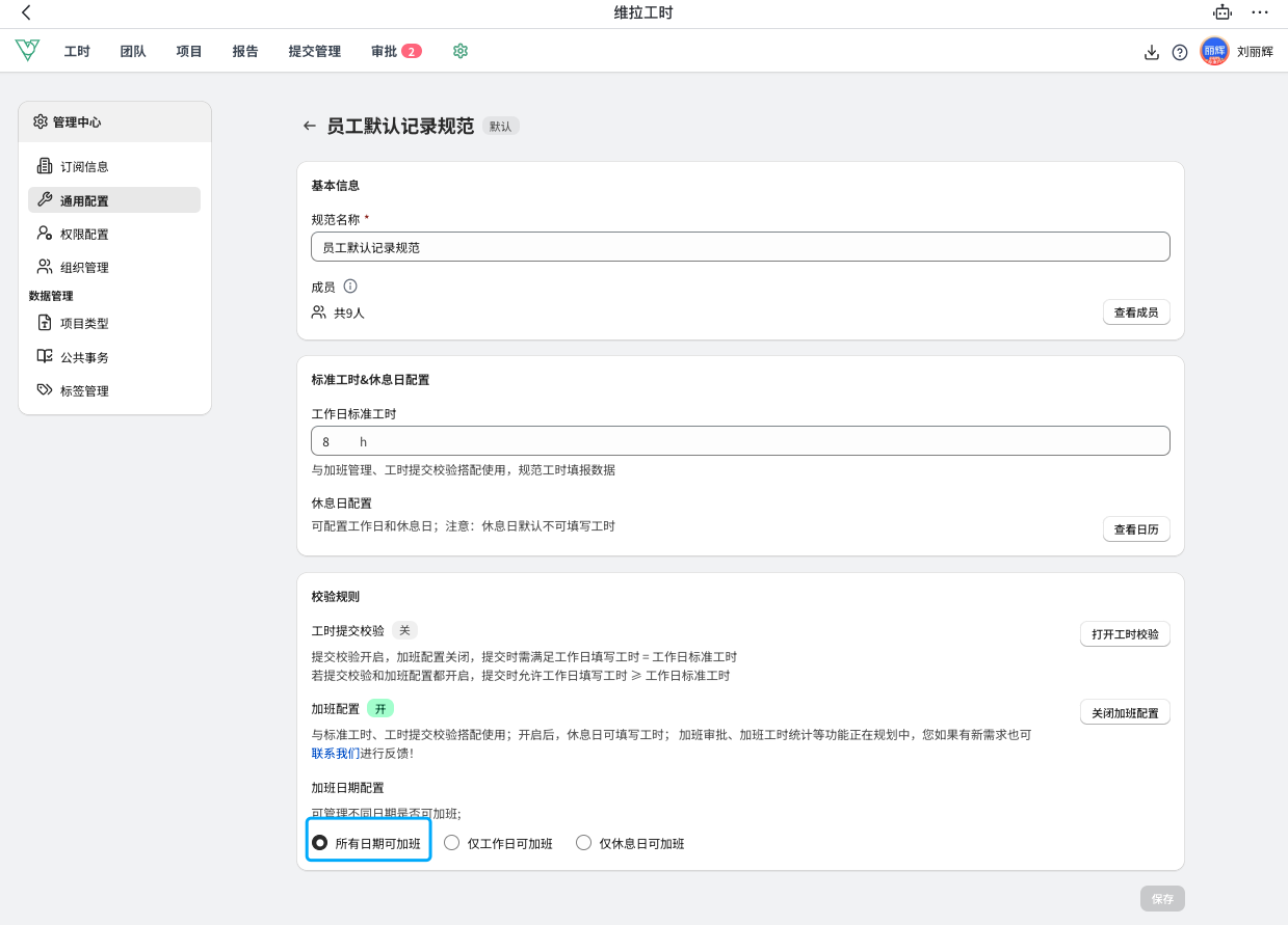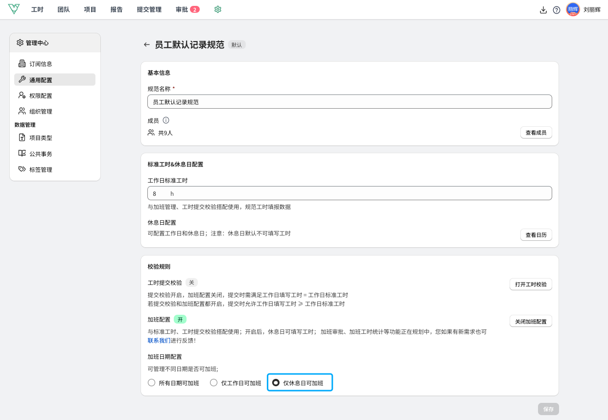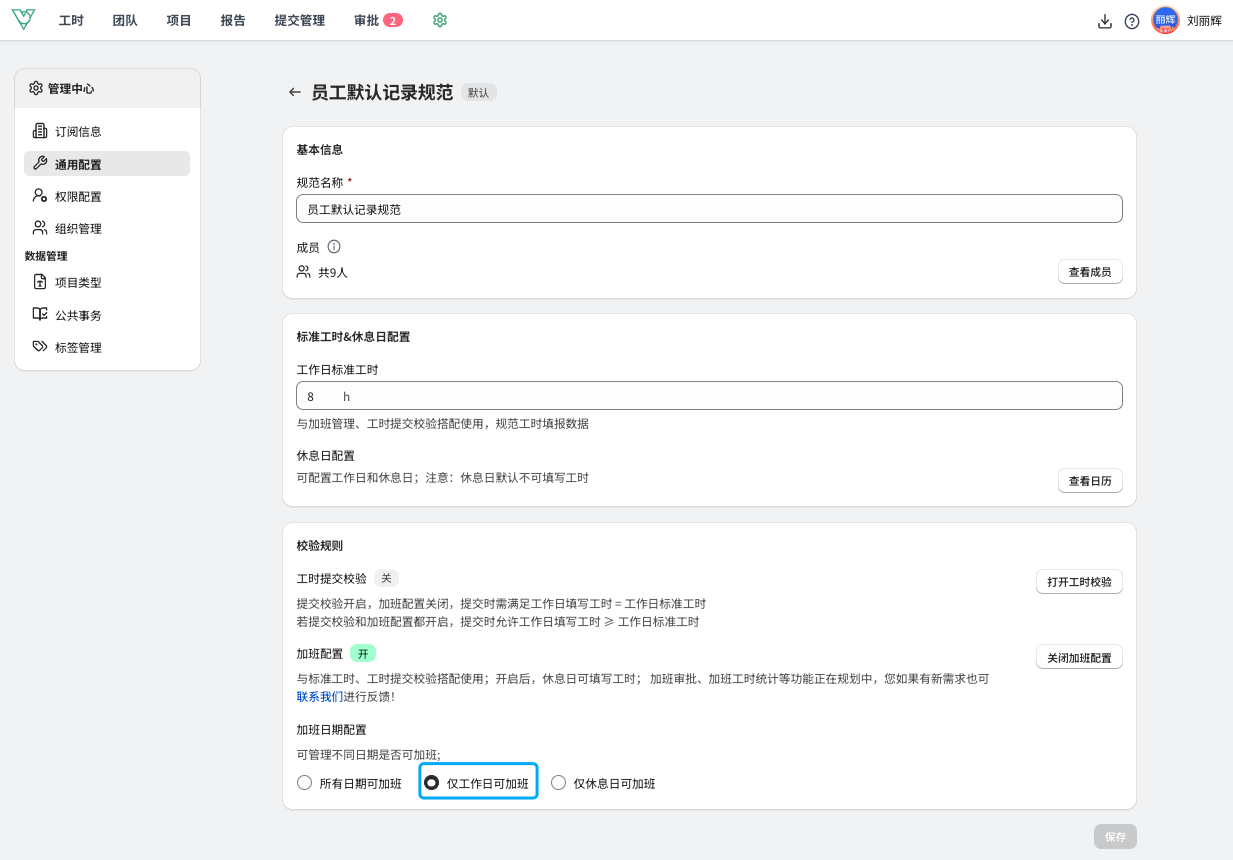 除了包括上述提交校验与加班配置功能外,为了满足更精细化的加班管理,Business企业开启加班管理时,可以分别管理工作日或休息日加班。