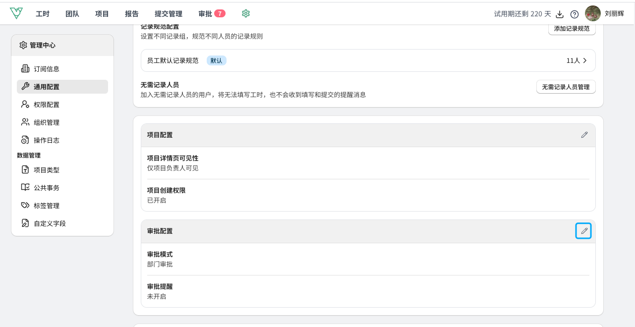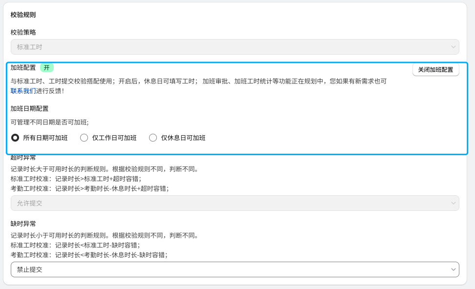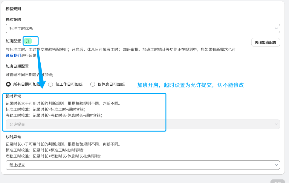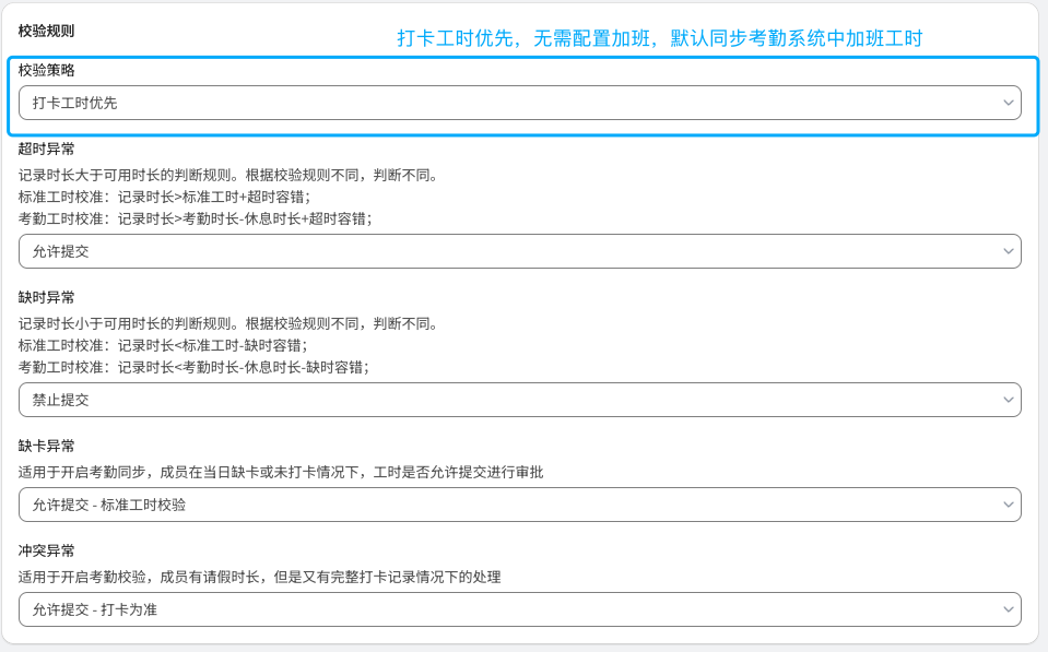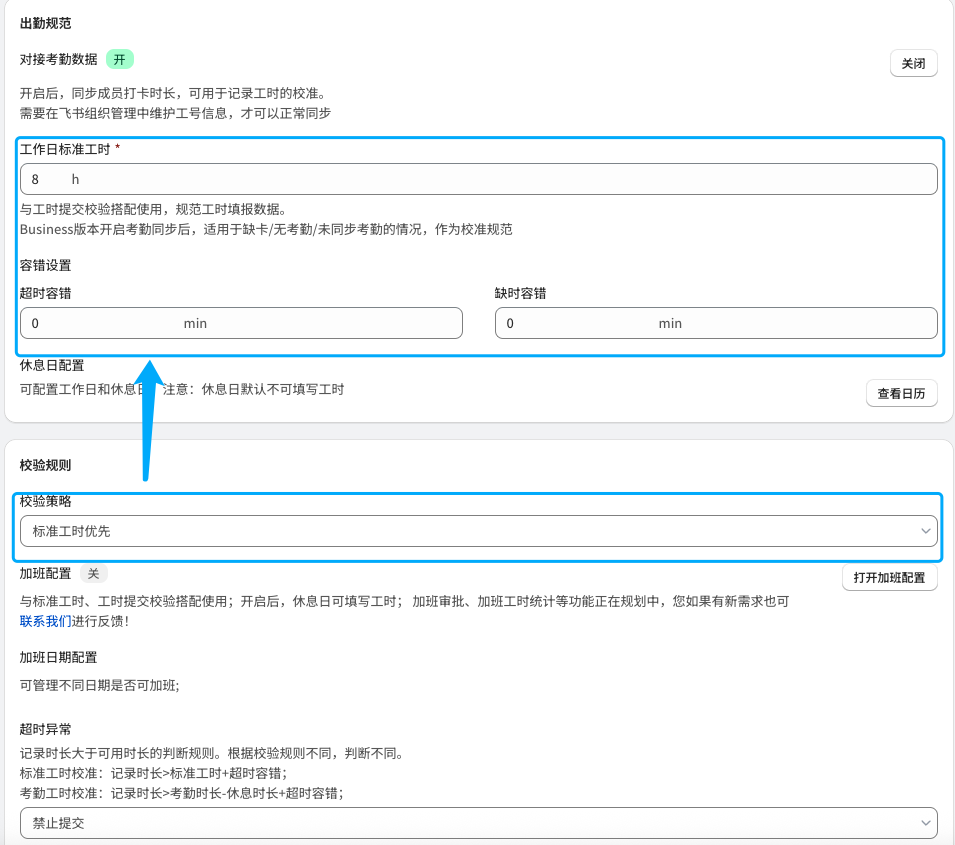 | 标准规则 | 1. 超时/缺时设置:针对超出或不足标准工时的情况进行设置 * 超时异常:记录工时超出(标准工时+超时容错)时,是否可以进行提交 * 缺时异常:记录工时不足(标准工时-缺时容错)时,是否可以进行提交 * 如果开启加班,则超时异常默认为允许提交,且不能修改 ![]() | 1. 超时/缺时设置:可以针对超出或不足出勤时长的情况分别单独进行配置 - 超时异常:记录工时超出(考勤工时-休息时长+超时容错)时,是否可以进行提交 - 缺时异常:记录工时不足(考勤工时-休息时长-缺时容错)时,是否可以进行提交 2. 打卡数据异常配置:开启考勤同步后,考虑到考勤同步有滞后性,在一些缺卡、冲突时下,可以单独配置填报规则 - 缺卡异常:考勤数据为缺卡时,记录和提交规则 - 允许提交-标准工时校验:可以进行记录并正常提交,提交时则按照标准工时校验 - 允许提交-不校验:可以进行提交,不进行任何校验。 - 不允许提交:无考勤数据则不允许提交,避免出现考勤和工时无法互相印证的情况。 - 冲突异常:考勤数据中出现全天请假同时有工时记录,或全天出勤又有请假的情况处理规则 - 允许提交-打卡为准:当日可以记录工时,并以打卡数据为校准基准进行校验 - 允许提交-请假为准:当日视为请假,请假日期填报规则跟进请假时是否允许填报进行判断 - 允许提交-不校验:当日可以记录工时,提交时不进行校验 - 不允许提交:当日不允许记录和提交工时 ![]() |