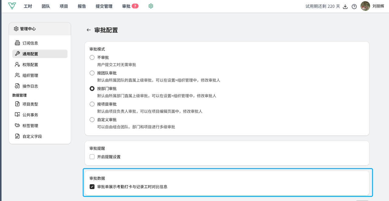- 勾选后,审批数据中可以展示考勤数据