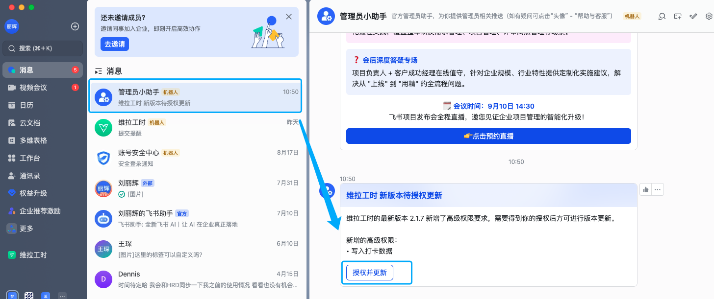 飞书管理后台/工作台/应用管理/维拉工时中,点击【更新】获取授权。页面链接 ![]() | 企业飞书管理员小助手会收到相关提示,点击【授权更新】可授权维拉工时获取打卡数据 ![]() |