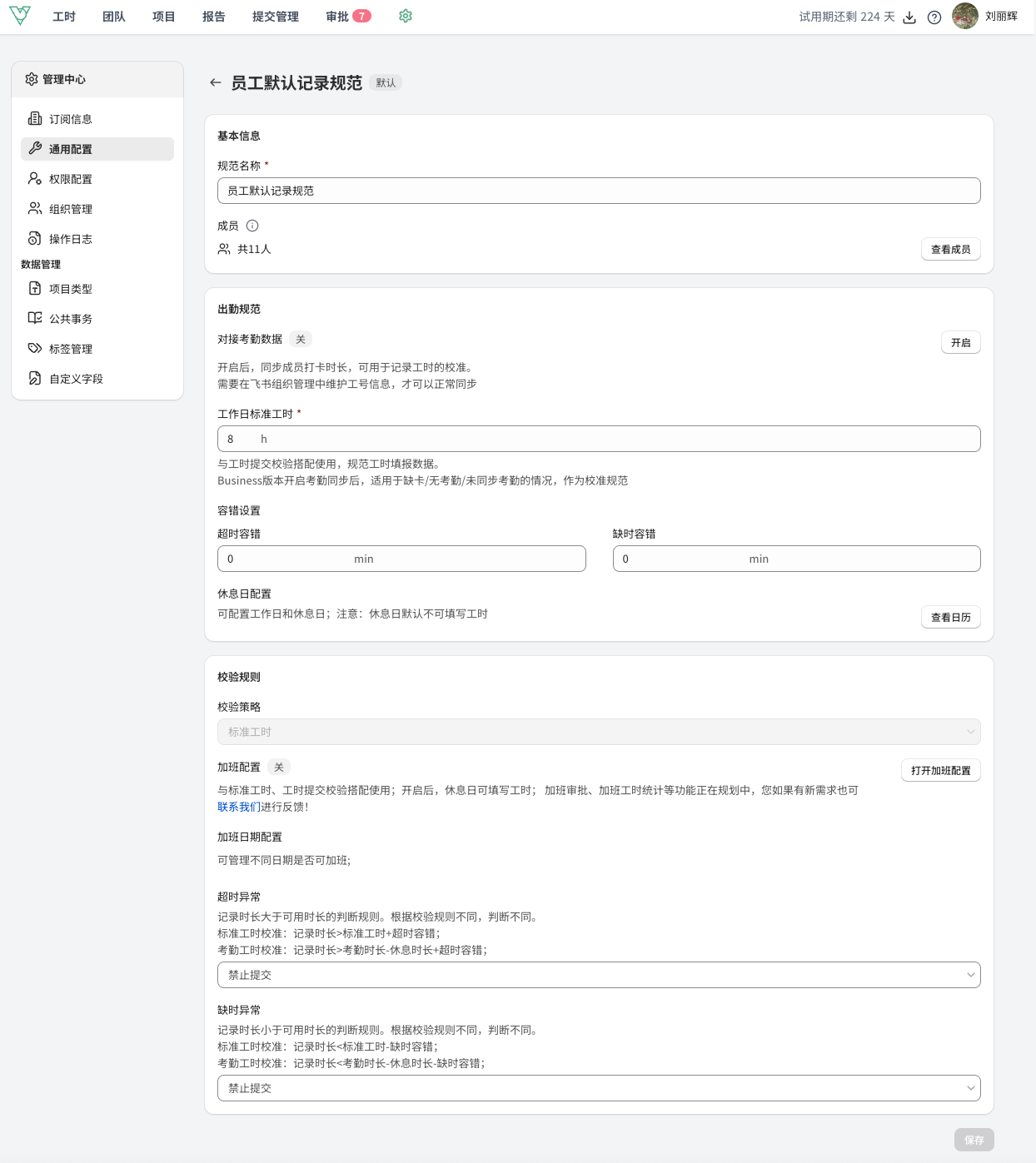 企业可以调整默认规范名称、标准工时时长、休息日配置和管理校验规则。
