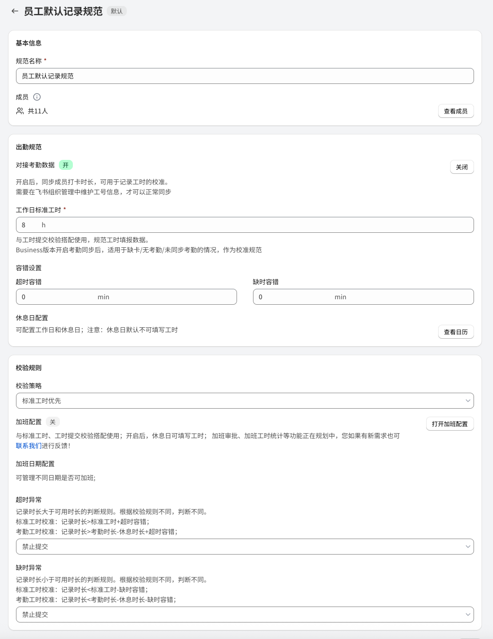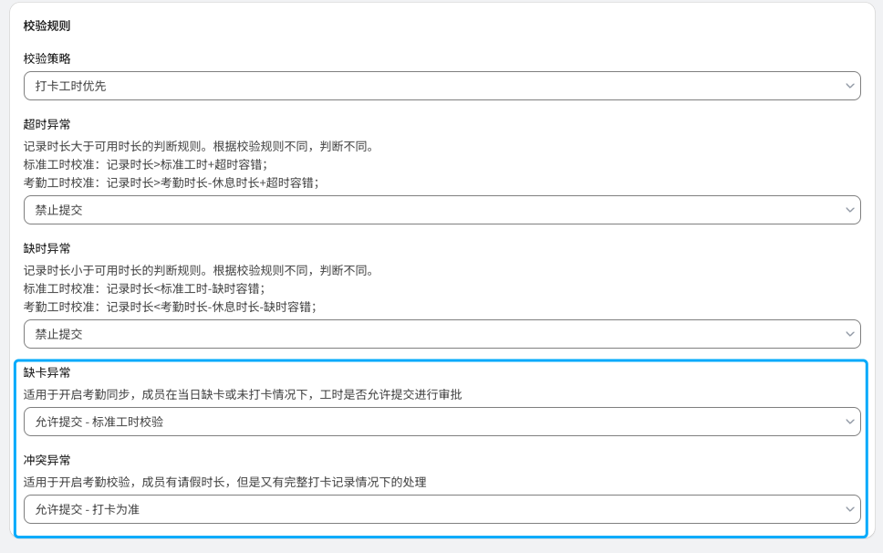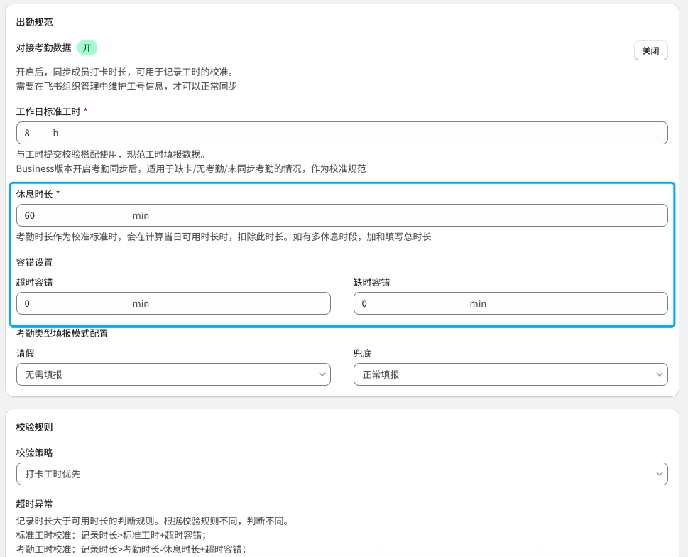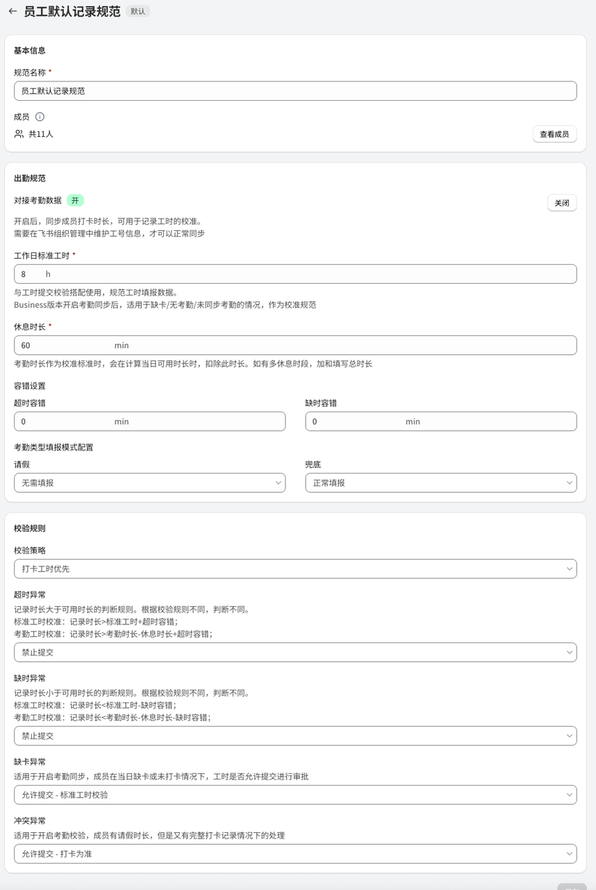 | 标准规则 | 1. 超时/缺时设置:针对超出或不足标准工时的情况进行设置 * 超时异常:记录工时超出(标准工时+超时容错)时,是否可以进行提交 * 缺时异常:记录工时不足(标准工时-缺时容错)时,是否可以进行提交 * 如果开启加班,则超时异常默认为允许提交,且不能修改 ![]() | 1. 超时/缺时设置:可以针对超出或不足出勤时长的情况分别单独进行配置 - 超时异常:记录工时超出(考勤工时-休息时长+超时容错)时,是否可以进行提交 - 缺时异常:记录工时不足(考勤工时-休息时长-缺时容错)时,是否可以进行提交 2. 打卡数据异常配置:开启考勤同步后,考虑到考勤同步有滞后性,在一些缺卡、冲突时下,可以单独配置填报规则 - 缺卡异常:考勤数据为缺卡时,记录和提交规则 - 允许提交-标准工时校验:可以进行记录并正常提交,提交时则按照标准工时校验 - 允许提交-不校验:可以进行提交,不进行任何校验。 - 不允许提交:无考勤数据则不允许提交,避免出现考勤和工时无法互相印证的情况。 - 冲突异常:考勤数据中出现全天请假同时有工时记录,或全天出勤又有请假的情况处理规则 - 允许提交-打卡为准:当日可以记录工时,并以打卡数据为校准基准进行校验 - 允许提交-请假为准:当日视为请假,请假日期填报规则跟进请假时是否允许填报进行判断 - 允许提交-不校验:当日可以记录工时,提交时不进行校验 - 不允许提交:当日不允许记录和提交工时 ![]() |