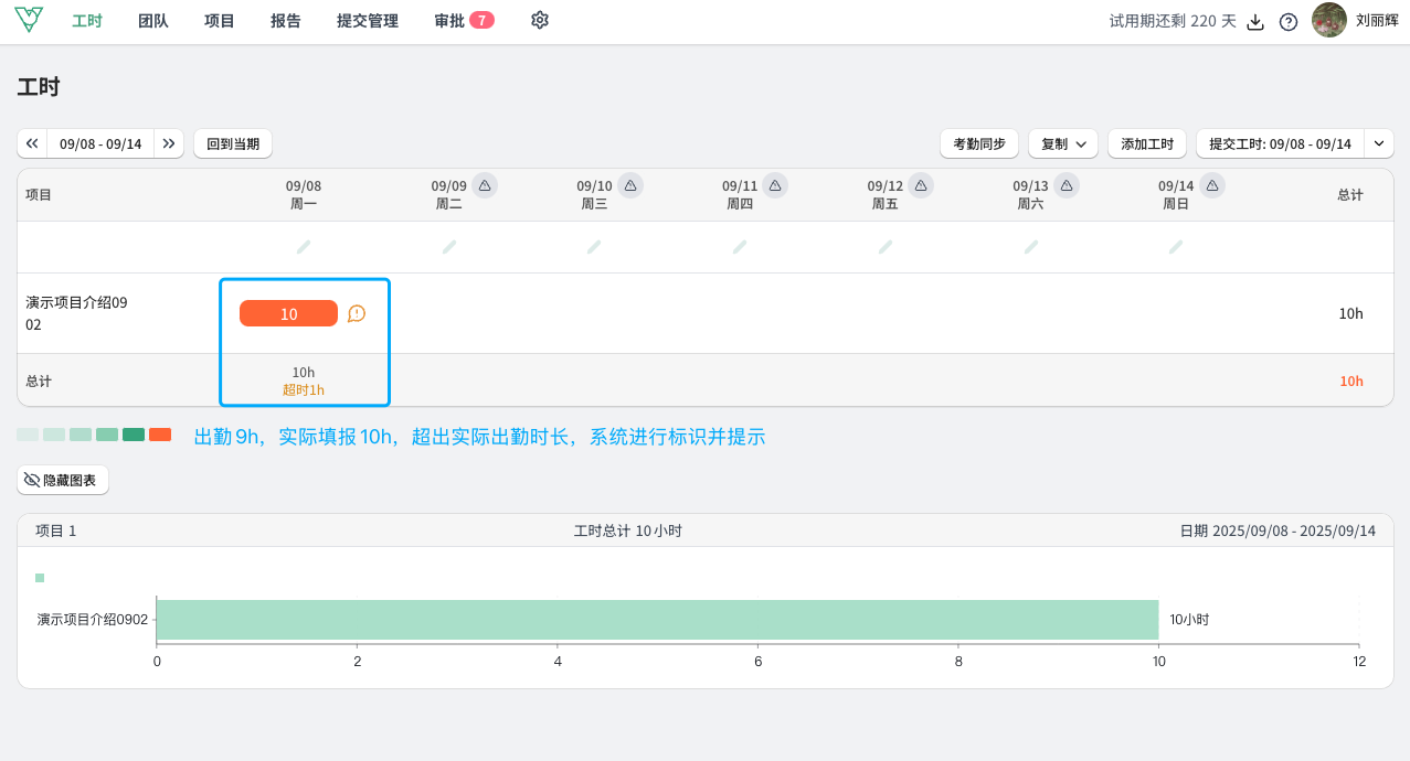 - 通过筛选统计指标、展示不同视图,可以查看每日/每周/每月工时的展示情况,方便去校对打卡和实际填报工时的差异